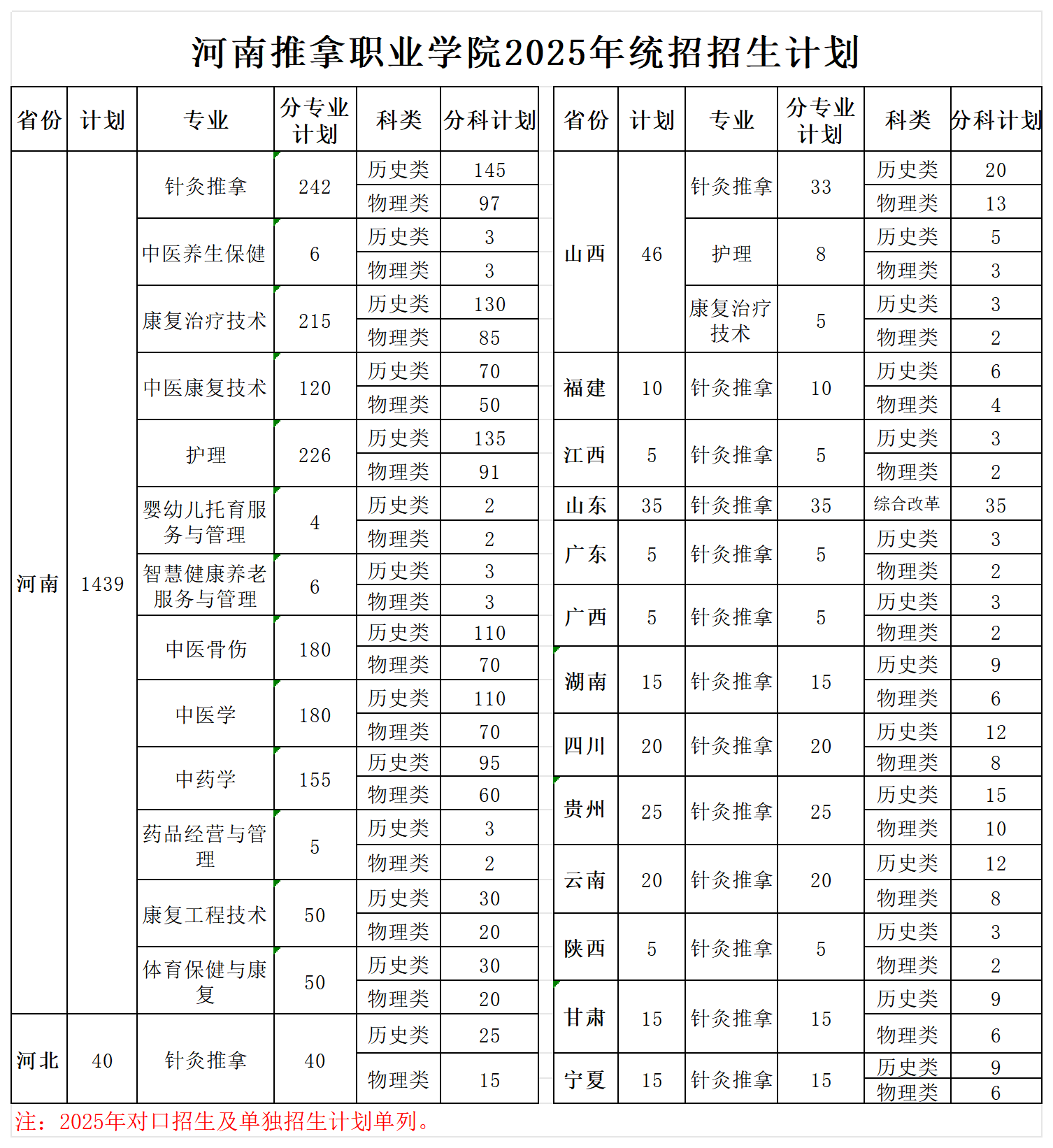 河南推拿职业学院2025年单独招生分类别计划表